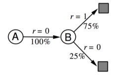 解释:应用MC算法,由于需要完整的Episode,因此仅Episode1可以用来计算A的状态价值,很明显是0;同时B的价值是6/8。应用TD算法时,TD算法试图利用现有的Episode经验构建一个MDP(如下图),由于存在一个Episode使得状态A有后继状态B,因此状态A的价值是通过状态B的价值来计算的,同时经验表明A到B的转移概率是100%,且A状态的即时奖励是0,并且没有衰减,因此A的状态价值等于B的状态价值。