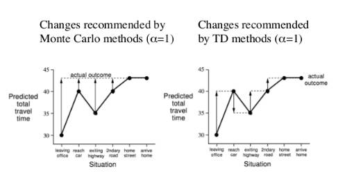 通过比较可以看出,TD算法使用了MDP问题的马儿可夫属性,在Markov 环境下更有效;但是MC算法并不利用马儿可夫属性,通常在非Markov环境下更有效。