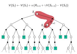 TD:采样,经历可不完整,用喜爱状态的预估状态价值预估收获再更新预估价值