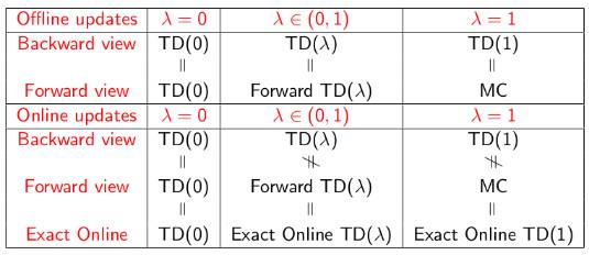 当λ=1时,TD(1)粗略看与每次访问的MC算法等同;在线更新时,状态价值差每一步都会有积累;离线更新时,TD(1)等同于MC算法。