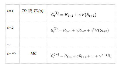 TD或TD(0)是基于1-步预测的,MC则是基于∞-步预测的: