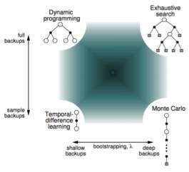 上图从两个维度解释了四种算法的差别,多了一个穷举法。这两个维度分别是:采样深度和广度。当使用单个采样,同时不走完整个Episode就是TD;当使用单个采样但走完整个Episode就是MC;当考虑全部样本可能性,但对每一个样本并不走完整个Episode时,就是DP;当既考虑所有Episode又把Episode从开始到终止遍历完,就变成了穷举法。