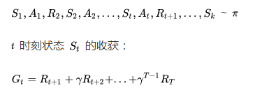 注:收获不是针对Episode的,它存在于Episode内,针对于Episode中某一个状态。从这个状态开始经历完Episode时得到的有衰减的即时奖励的总和。从一个Episode中,我们可以得到该Episode内所有状态的收获。当一个状态在Episode内出现多次,该状态的收获有不同的计算方法,下文会讲到。