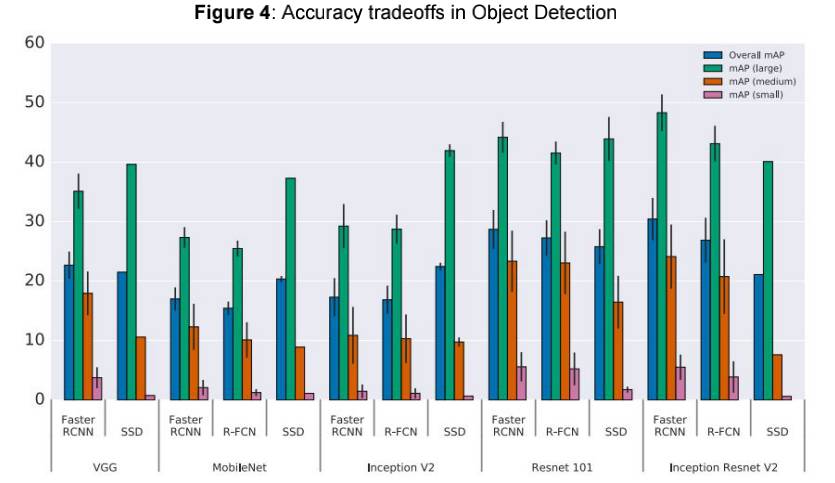 Note: Y-axis displays mAP (mean Average Precision) and the X-axis displays meta-architecture variability across each feature extractor (VGG, MobileNet...Inception ResNet V2). Additionally, mAP small, medium and large describe the average precision for small, medium and large objects, respectively. As such accuracy is “stratified by object size, meta-architecture and feature extractor” and “image resolution is fixed to 300”. While Faster R-CNN performs comparatively well in the above sample, it is worth noting that the meta-architecture is considerably slower than more recent approaches, such as R-FCN.