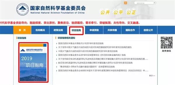 国家自然科学基金委员会2019年项目指南已正式发布!如上图所示:进入国家自然科学基金委员会主页,点击项目指南(红色框所示),在弹出页面中点击左侧2019年项目指南查看详细内容