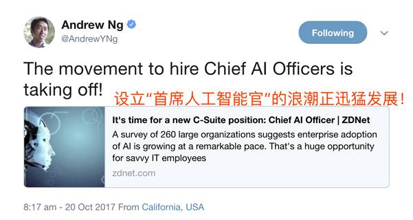 Andrew Ng曾在《Hiring Your FirstChief AI Officer》中表示人工智能在未来将如同电力和互联网一样比不可少
