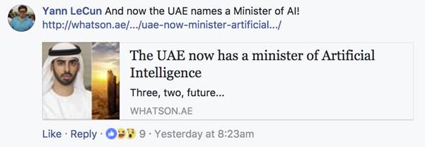 Yann LeCun 在评论中还提到:10月19号,一向意识超前阿联酋甚至在全世界首次任命了一位“人工智能国家部长”。据了解,阿联酋的首位人工智能部长是现年27岁的Omar Bin Sultan Al Olama。阿联酋副总统和总理ShaikhMohammad Bin Rashid Al Maktoum在上周四的一份声明中表示“我们希望阿联酋成为世界上人工智能准备最充分的国家”。随着科技公司开始围绕人工智能展开商业模式,像阿联酋这样的国家以及像迪拜这样的城市在技术上投入了大量的资金,这一点也不奇怪,因为他们想要站在这一发展的最前沿。