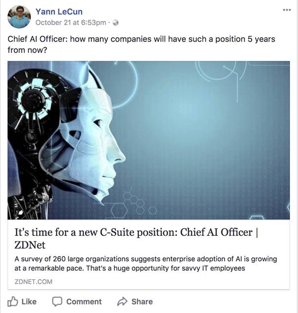 Yann Lecun 也大胆的设问,按着现在的趋势,5年后会有多少公司会设置“首席人工智能官”?
