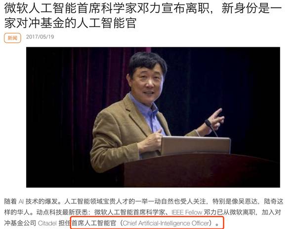 在今年5月份微软领导人工智能研究的首席科学家邓力宣布离职,加入一家对冲基金担任“首席人工智能官”
