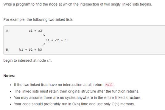 思路:题目让求两个单链表的起始交叉点,但是给出了很多限制。要求不开辟额外空间,时间复杂度是O(n),这样我们就不能双重循环遍历两个链表来做。题目要求函数结束之后两个链表不能发生改变,这样我们就不能转置链表来做。想到直接从前往后遍历两个链表,就面临着不能同时到达交叉点的问题,因为两个链表有可能不一样长。如果两个链表一样长就好办了,第一个相同的当前节点就是交叉点。分别遍历两个链表求出各自长度len1, len2. 较短的链表从头开始遍历,较长的链表从|len2-len1|+1节点开始遍历,这时候两个链表就“一样长”了,第一个相同的当前节点即为所求。