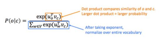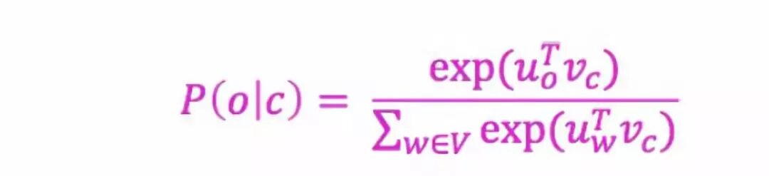 之后,对于中心词c和上下文词o我们可以通过如下公式计算到: