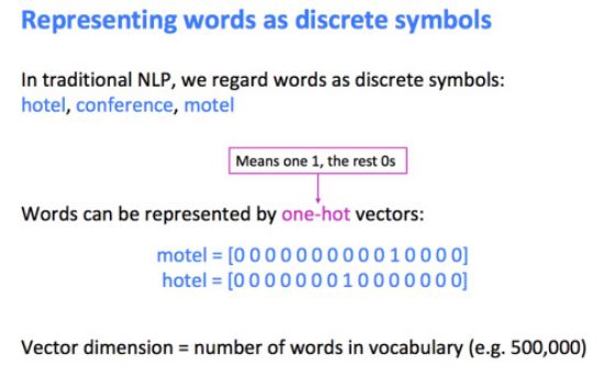 motel = [0 0 0 0 0 0 0 0 0 0 1 0 0 0 0], hotel = [0 0 0 0 0 0 0 1 0 0 0 0 0 0 0], 这两个向量是正交的(orthogonal)。他们之间没有相似度(cos90°=0)。 所以对于one-hot vectors,没有相似(similarity)的概念。