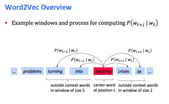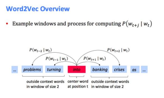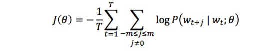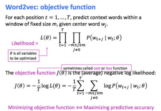• Word2vec:目标函数(objective function) 对于每个位置,预测在给定中心词的固定大小为的窗口内的上下文词。如下图: