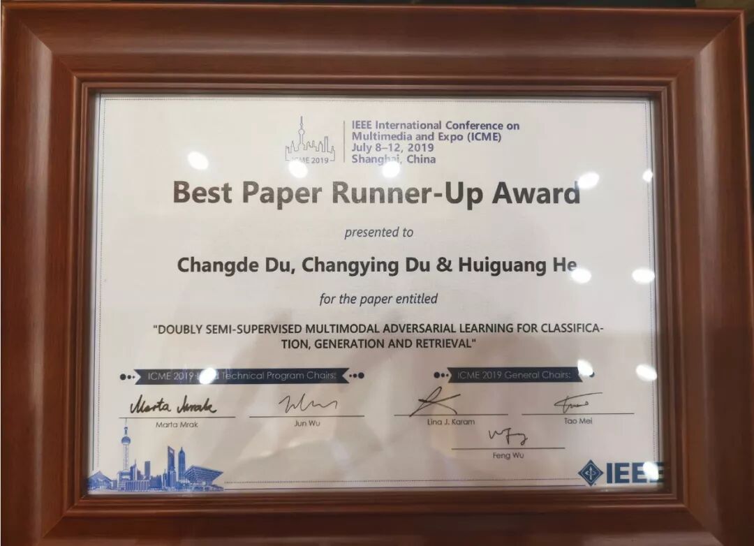 中科院自动化研究所类脑智能研究中心博士生杜长德的论文《Doubly Semi-supervised Multimodal Adversarial Learning for Classification, Generation and Retrieval》获得最佳论文亚军奖(Best Paper Runner Up Award)。