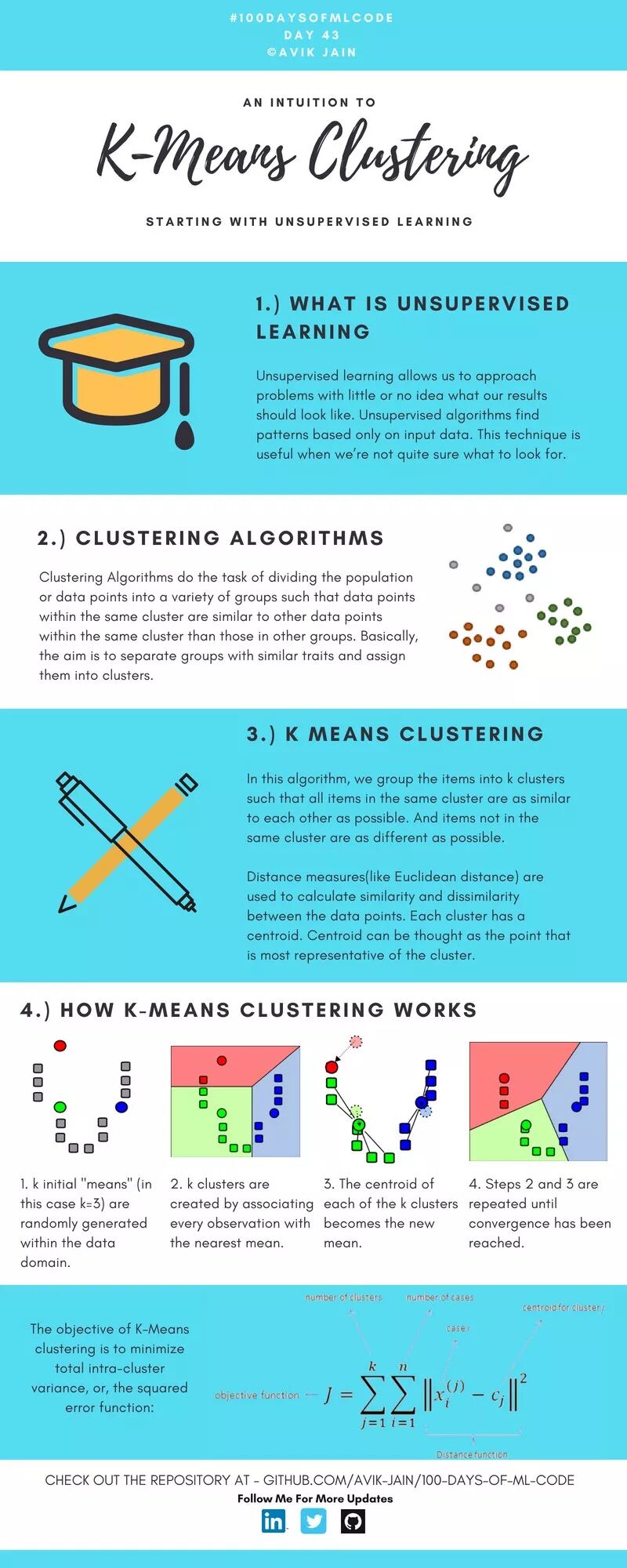 转到无监督学习,并研究了聚类。可在作者网站查询。发现一个奇妙的动画有助于理解K-均值聚类。