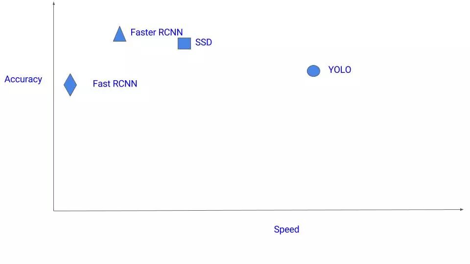 这有很多算法。你应该使用哪一个?目前,如果您对准确率很狂热,则选择Faster RCNN。 但是,如果你计算资源紧缺(可能在Nvidia Jetsons上运行),SSD是一个更好的建议。 最后,如果精度不是太高,但是想要超快速度,YOLO将会是一个很好的选择。下图是对速度与精度之间平衡的一个示意图: