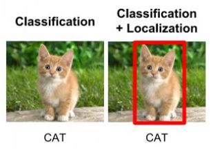 我们的模型会预测什么?为了解决这个问题,我们可以训练一个多标签分类器来预测这两个类(狗和猫)。但是,我们仍然不知道猫或狗的位置。在图像中识别目标(给定类)位置的问题称为定位。但是,如果目标类不确定,我们不仅要确定位置,还要预测每个目标的类别。