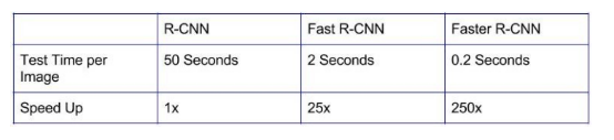 为了应对长宽比和物体尺寸的变化,Faster R-CNN引入了锚框(anchor boxes)的思想。在每个位置,原始论文使用128x128,256×256和512×512比例的三种锚框。同样,对于宽高比,它使用三种宽高比:1:1,2:1和1:2。所以,在每个位置我们有总共9个boxes,RPN预测这9个boxes是背景或前景的概率。我们应用 bounding box回归来改进每个位置的锚框。因此,RPN给出了各种大小的bounding boxes和其相应每个类的概率。像Fast-RCNN一样,可以通过应用空间池化来进一步传递不同大小的边界框。 剩下的网络与Fast-RCNN相似。 . Faster-RCNN比Fast-RCNN快10倍,在VOC-2007数据集上准确率一样。 这就是为什么Faster-RCNN一直是最精确的目标检测算法之一。 这是RCNN各种版本之间的速度比较。