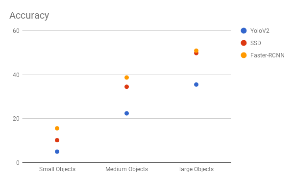 SSD似乎是一个不错的选择,因为我们可以在视频上运行它,而且精度的折衷很少。 但是,可能并不那么简单,请查看此图表,它比较了SSD,YOLO和Faster-RCNN在各种大小物体上的性能。 在大尺寸下,SSD似乎与Faster-RCNN类似。 但是,当物体尺寸较小时,我们以精度来衡量,其差距就会扩大。