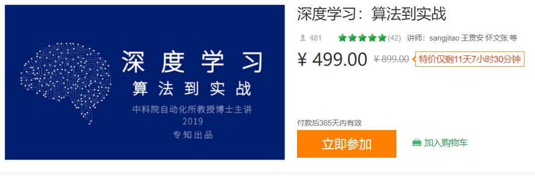 专知2019年《深度学习:算法到实战》精品课程,481位同学在学习,现在报名,限时优惠!网易云课堂人工智能畅销榜首位