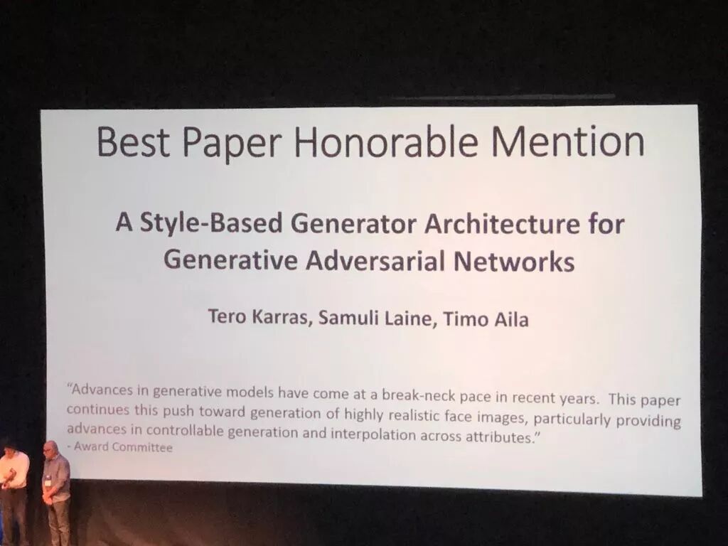论文奖委员会的授奖理由:近几年来,生成式模型方面的技术进步来到了一个瓶颈期。这篇论文在生成高逼真度人脸这一研究方向上作出了继续的进步,尤其在生成过程的可控制性以及不同属性之间的互相搭配方面作出了改进。
