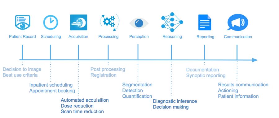 诊断放射学工作流程的简化示意图,以及可实施AI系统的示例。图像版权