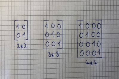 您可以通过以下事实来发现单位矩阵:它沿对角线为1,其他每个值都为零。它也是一个“方阵”,意思是它的行数与列数相同。