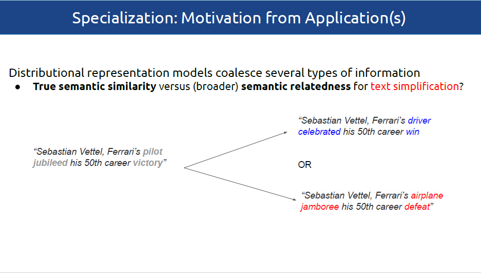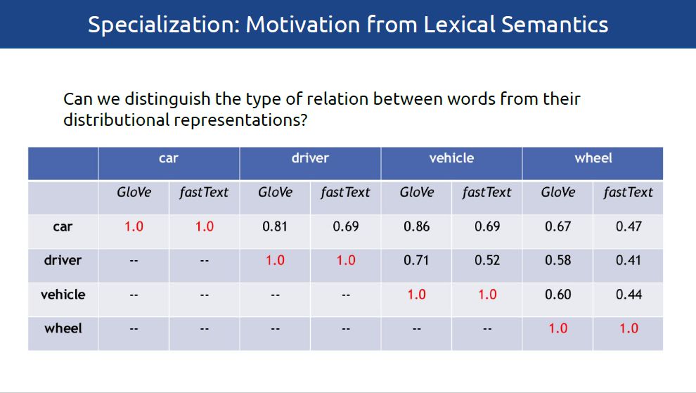 当前,分布式词向量已经成为NLP模型必不可少的一部分。基于潜在分布假设,分布式词向量,融合了各种聚合型和组合型的词汇语义关系。比如,基于分布式向量空间距离的主题关联,经常不能区分诸如同义词、相似词(car-automobile)或者词义蕴含(car-vehicle)等这些关系。由于不同的词汇语义关系支持不同的NLP应用,所以分布式空间的内在属性通常会影响下游应用的表现。如语义相似性为意译、对话状态跟踪和文本简化提供了指导,词义蕴涵支持自然语言推理和分类归纳,而更加广泛的主题关联则有助于命名实体识别、文本分类以及检索等任务。