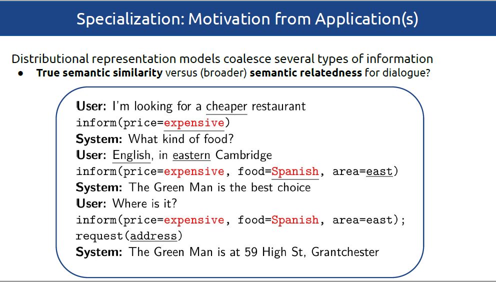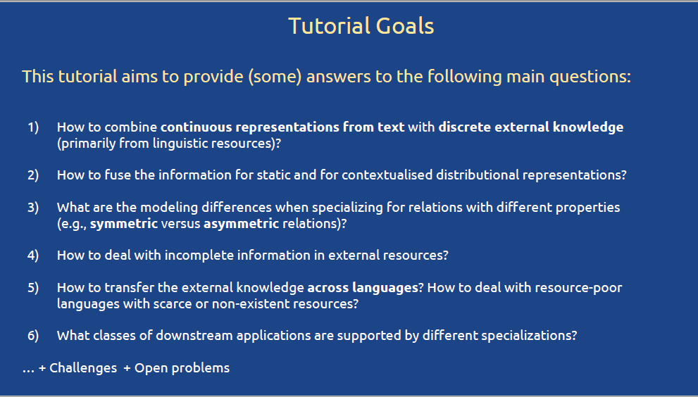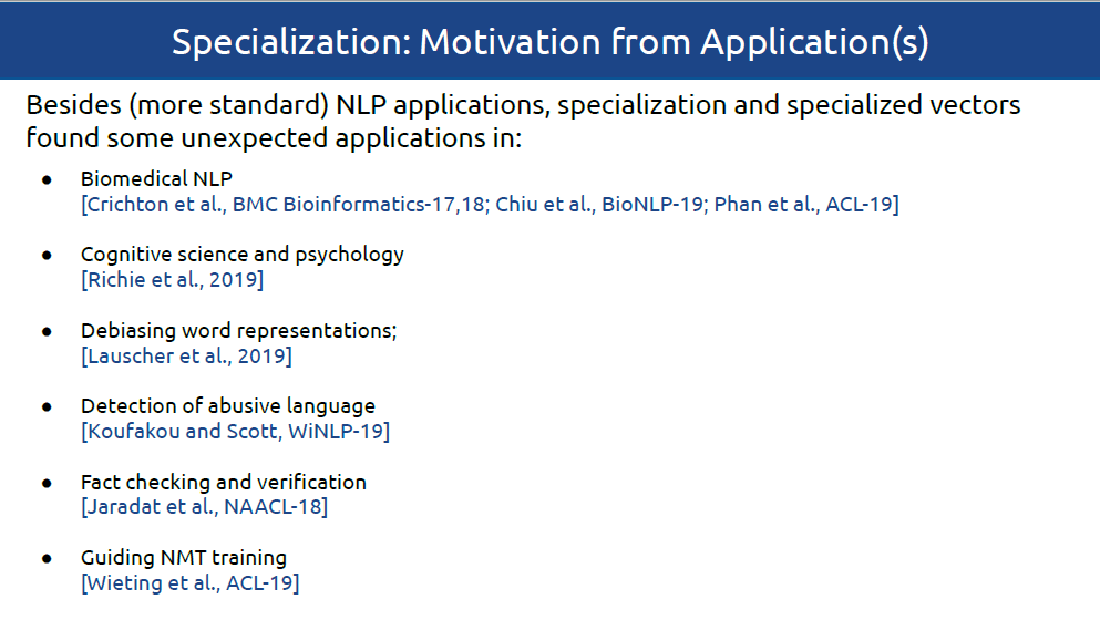 在该教程中,作者对分布式词向量的语义特定化(Semantic Specialization of Distributional Word Vectors)方法进行了全面的概述,包括以下几点:1)joint specialization 方法,利用外部语言约束来增强分布式学习的目标。2)post-processing retrofitting模型:微调预训练的分布式词向量,以便更好地反映外部语言约束。3)最新提出的post-specialization方法,能够将2)中的post-processing方法扰动推广到整个分布式空间。