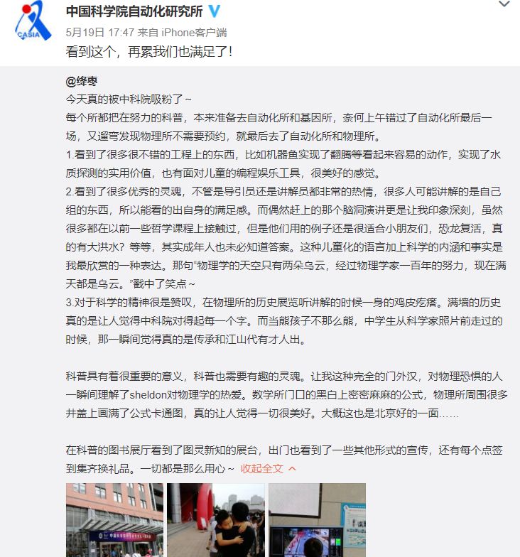 “青年兴则国家兴,青年强则国家强。青年一代有理想、有本领、有担当,国家就有前途,民族就有希望。”自动化所表示,希望通过本次开放日的项目展示和体验,让公众切身感受到智能技术带来的社会变革,激发青年一代对科学研究的兴趣,培养讲科学、爱科学、学科学、用科学的精神。