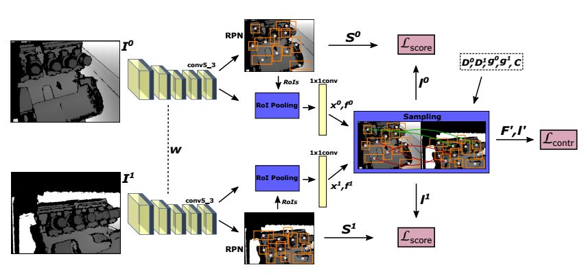 摘要:Finding correspondences between images or 3D scans is at the heart of many computer vision and image retrieval applications and is often enabled by matching local keypoint descriptors. Various learning approaches have been applied in the past to different stages of the matching pipeline, considering detector, descriptor, or metric learning objectives. These objectives were typically addressed separately and most previous work has focused on image data. This paper proposes an end-to-end learning framework for keypoint detection and its representation (descriptor) for 3D depth maps or 3D scans, where the two can be jointly optimized towards task-specific objectives without a need for separate annotations. We employ a Siamese architecture augmented by a sampling layer and a novel score loss function which in turn affects the selection of region proposals. The positive and negative examples are obtained automatically by sampling corresponding region proposals based on their consistency with known 3D pose labels. Matching experiments with depth data on multiple benchmark datasets demonstrate the efficacy of the proposed approach, showing significant improvements over state-of-the-art methods.