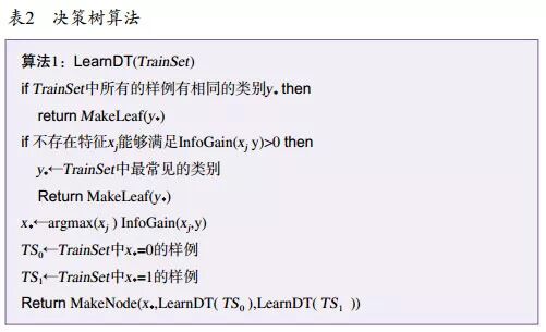 最后,我们需要一个搜索方法,能够在假设空间中找到评价函数得分最高的那个分类器。优化技术的选择对学习器效率至关重要;而当评价函数有多个最优结果时,优化技术也有助于从中选择。初学者通常会采用现成的优化方法,之后再用定制专门的优化方法来替代。表 1 展示了三个组成部分常见的例子。例如,对一个测试样例, k-近邻方法会寻找它的 k 个最相似的训练样例,并将这些样例中出现最多的类别作为该测试样例的类别。超平面方法会为每一个类别构造一个特征的线性组合,并将得分最高的组合所对应的类别作为预测结果。决策树方法会在树上的每个内部节点测试一个特征,每个特征值会对应一个分支,而不同的叶子节点会对应不同的类别。算法 1 展示了一个极简单的二分类决策树学习器,其中使用了信息增益(informationgain)和贪心搜索(greedysearch)【20】。InfoGain(xj,y ) 表示特征 xj 与类别 y 之间的互信息(mutualinformation)。 MakeNode(x,c0,c1 ) 会返回一个测试特征 x 的节点,该节点以 c0 作为 x