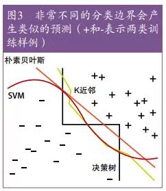 采用更聪明的算法得到的回报比预期要少,一部分原因是,机器学习的工作机制基本上是相同的。这个论断也许让你吃惊,特别是当你想到诸如规则集与神经网络之间差异巨大的表示方法的时候。但实际上,命题规则的确可以轻易地表示成神经网络,其他表示之间也有类似的关系。本质上所有的学习器都是将临近的样例归类到同一个类别中;关键的不同之处在于“临近”的意义。对于非均匀分布的数据,不同的学习器可以产生迥乎不同的分类边界,同时仍能在关心的领域(即那些有大量训练样例、测试样例也会有很大概率出现的领域)保证得到相的预测结果。这也有助于解释为什么能力强的学习器虽然不稳定却仍然很精确。图 3在二维空间展示了这一点,在高维空间这个效应会更强。