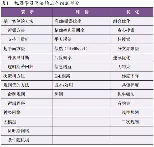 当然,并不是表 1 中从各列选出元素的相互组合都同样有意义。例如,离散表示很自然地与组合优化相结合;而连续表示则与连续优化相结合。然而,很多学习器同时包含离散和连续的部分。实际上,所有可能的组合也都快被实现过了。