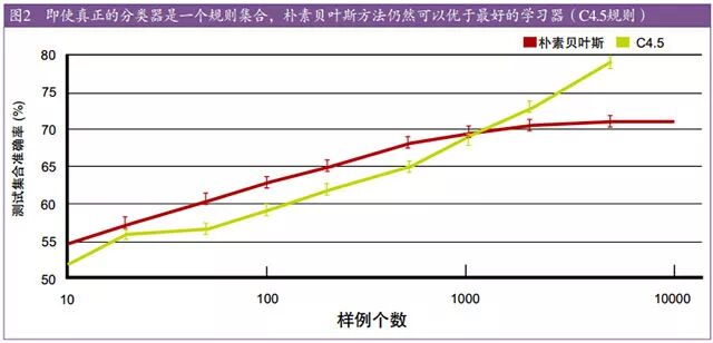 图 2 示例说明了这一点(注:训练样例含有 64 个布尔类型特征和 1 个根据一个集合的“如果…那么…”的规则集合计算得到的布尔类型的类别。图中的曲线是对 100 次运行结果的平均,每次对应不同的随机产生的规则集合。误差条(error bar)代表两个标准方差。具体细节请参考论文【10】)。即使真正的分类器是一个规则集合,但根据 1000个样例学习的朴素贝叶斯学习器(摘注:原文 Naive Bayes)仍比一个规则学习器的准确率更高。甚至当朴素贝叶斯错误地假设分类面是线性的,也依然如此。这种情形在机器学习领域很常见:一个强错误假设比那些弱正确假设更好,这是因为后者需要更多的数据才能避免过拟合。