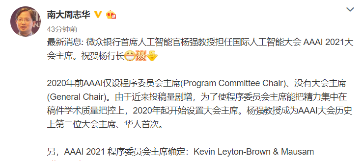 根据周志华老师在微博的消息,微众银行首席人工智能官(CAIO)、香港科技大学教授杨强将担任国际人工智能大会 AAAI 2021大会主席