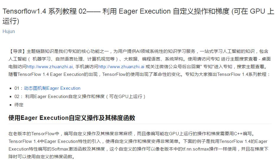 【导读】主题链路知识是我们专知的核心功能之一,为用户提供AI领域系统性的知识学习服务,一站式学习人工智能的知识,包含人工智能( 机器学习、自然语言处理、计算机视觉等)、大数据、编程语言、系统架构。使用请访问专知 进行主题搜索查看 - 桌面电脑访问http://www.zhuanzhi.ai, 手机端访问http://www.zhuanzhi.ai 或关注微信公众号后台回复" 专知"进入专知,搜索主题查看。随着TensorFlow 1.4 Eager Execution的出现,TensorFlow的使用出现了革命性的变化。专知为大家推出TensorFlow 1.4系列教程: