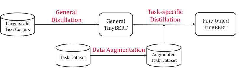 TinyBERT的使用过程分为以下三个步骤:蒸馏、数据增强以及特定任务蒸馏。接下来将会对每个步骤进行详细的介绍: