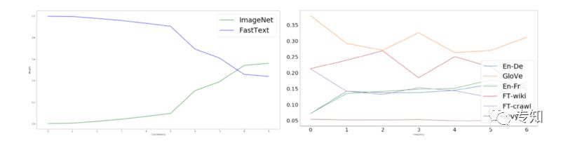 除了令人印象深刻的性能结果之外,动态元嵌入还隐含了一些关于不同字嵌入算法性能的有趣见解。 下面的图表说明了动态元嵌入的偏好,给出了具体的已知单词或低频单词。 我们可以清楚地看到,ImageNet词嵌入模型对于混合词是首选,而Glove在使用低频词的情境中是首选。