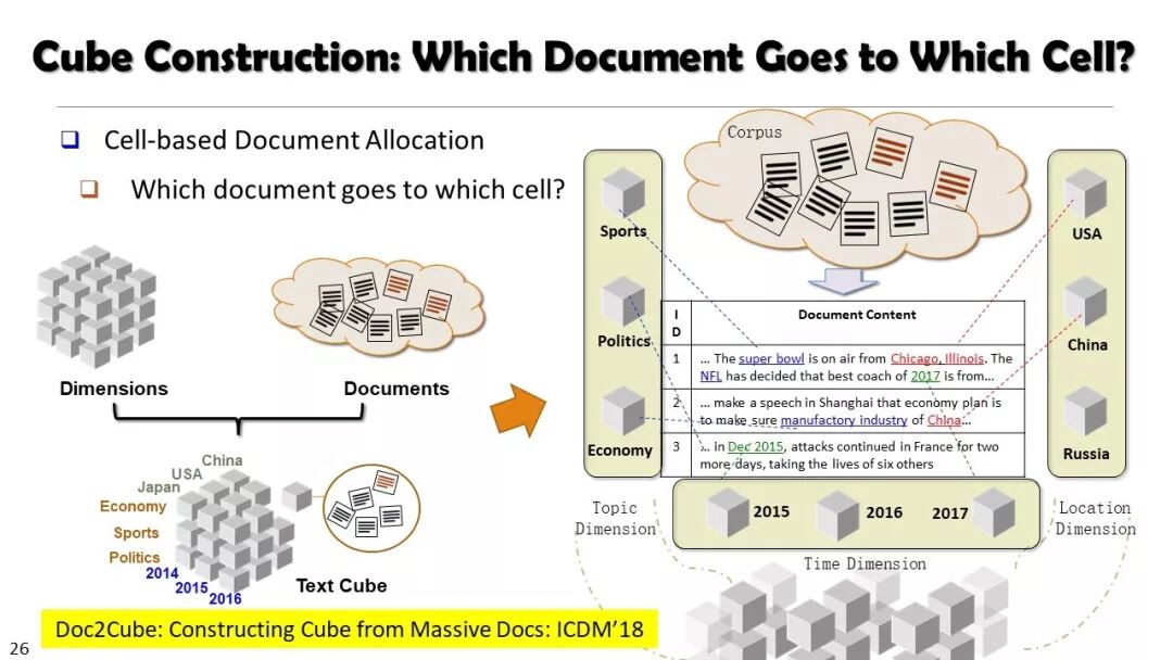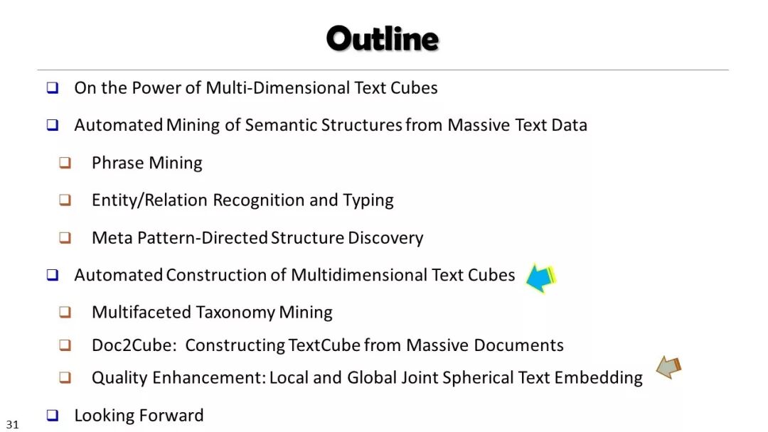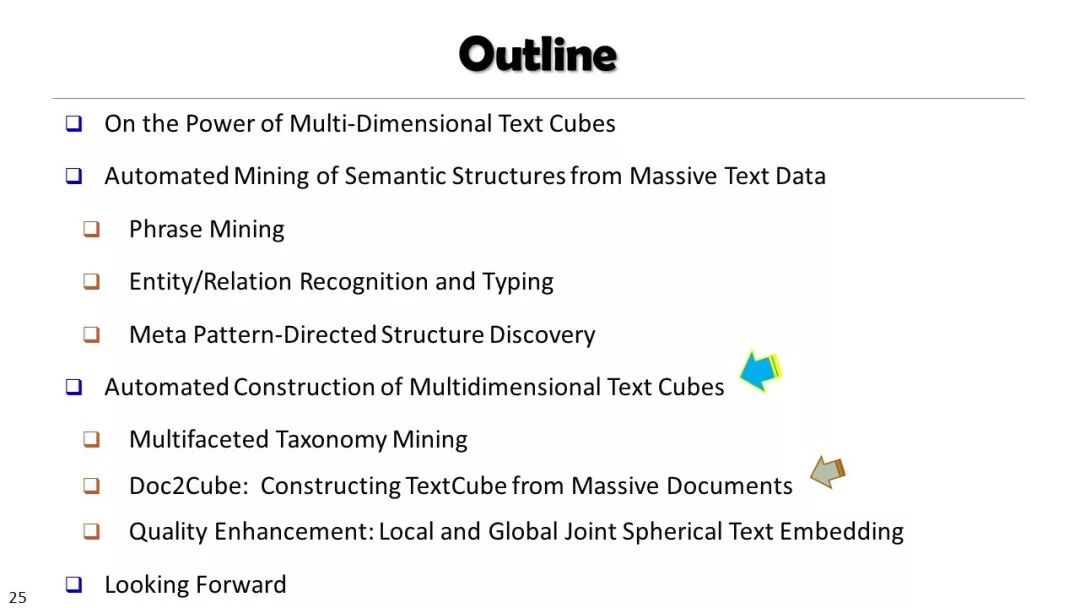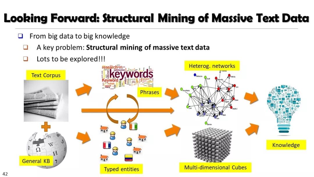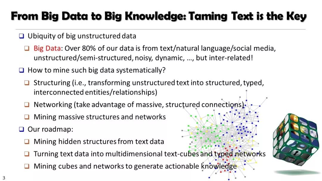 现实世界的大数据以自然语言文本的形式,在很大程度上是非结构化的、相互关联的、动态的。将如此庞大的非结构化数据转换为结构化知识是非常必要的。许多研究人员依赖于劳动密集型的标记和管理来从这些数据中提取知识,这可能是不可扩展的,特别是考虑到许多文本语料库是高度动态的和特定于域的。我们认为,大量的文本数据本身可能揭示了大量隐藏的模式、结构和知识。基于领域无关和领域相关的知识库,我们探索海量数据本身将非结构化数据转化为结构化知识的能力。通过将大量的文本文档组织成多维文本数据集,可以有效地提取和使用结构化的知识。在这次演讲中,我们介绍了一组最近开发的用于这种探索的方法,包括挖掘质量短语、实体识别和键入、多面分类构造以及多维文本立方体的构造和探索。结果表明,数据驱动方法是将海量文本数据转化为结构化知识的一个有前途的方向。