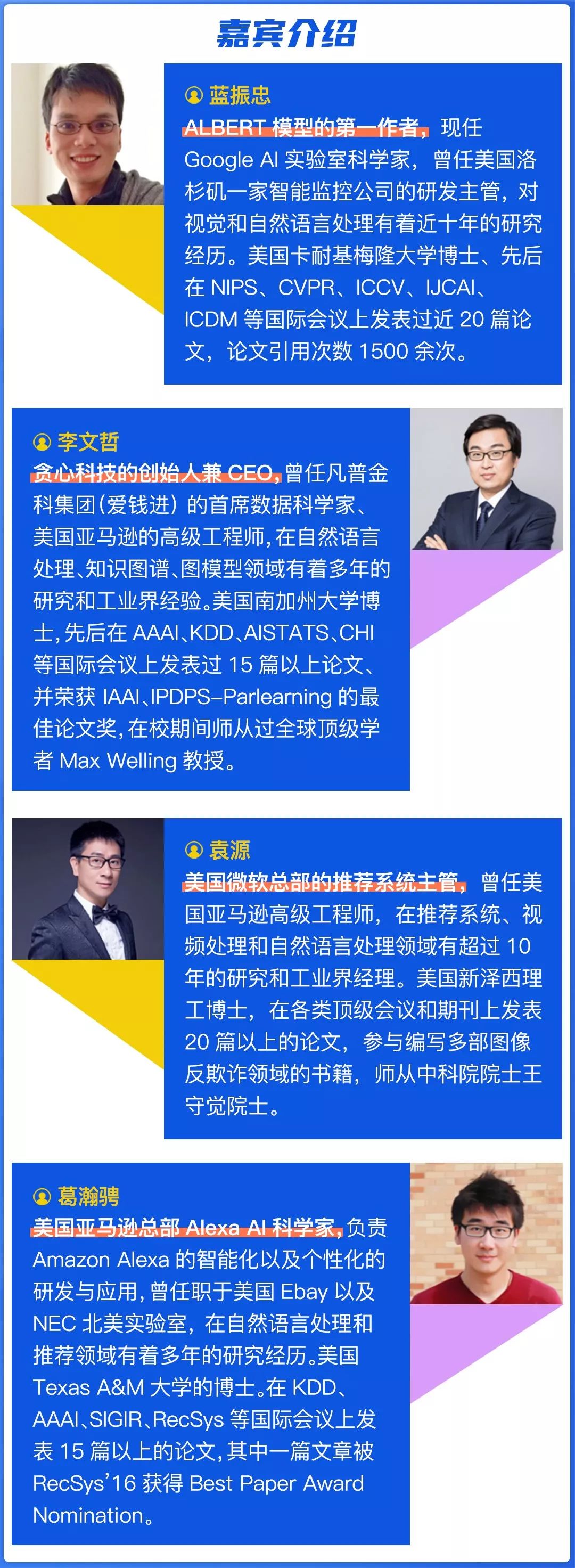本次专题活动除了贪心科技的创始人,我们还联合了国内外多位NLP领域专家,包括蓝振忠(ALBERT模型第一作者,Google Lab科学家,卡耐基梅隆大学博士),葛瀚骋(Amazon Alexa部门科学家,Texas A&M大学博士), 袁源(美国微软推荐系统主管,新泽西理工博士)。