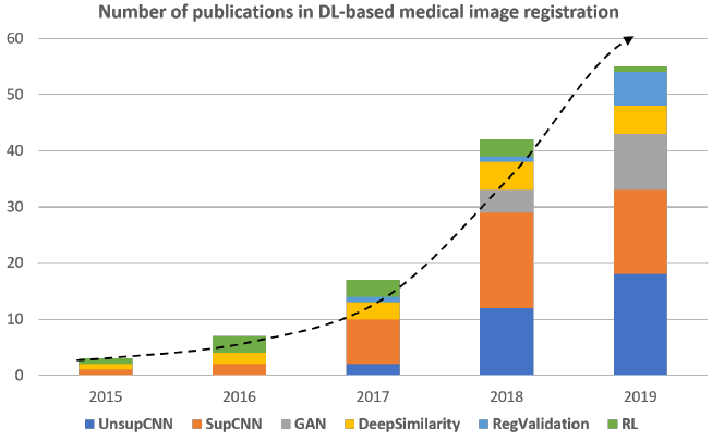 图2. 基于深度学习的医学图像配准中出版的文章数量。虚线表示近年来人们对基于深度学习的配准方法越来越感兴趣。“ DeepSimilarity”是在传统配准框架中使用基于DL的相似性度量的类别。“ RegValidation”代表使用DL进行配准验证的类别。