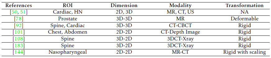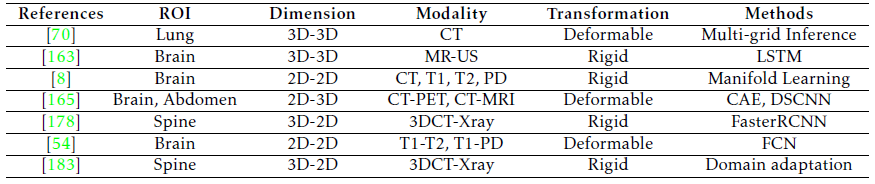 医学图像配准是一个广泛的课题,可以从不同的角度进行分类。从输入图像的角度来看,挂号方式可以分为单峰挂号、多峰挂号、患者间挂号、患者内挂号(如当天挂号或当日挂号)。从变形模型的角度看,配准方法可分为刚性配准方法、仿射配准方法和可变形配准方法。从感兴趣区域(ROI)的角度来看,配准方法可以根据脑、肺等解剖部位进行分组。从图像对维数的角度来看,配准方法可分为3D到3D、3D到2D、2D到2D/3D。不同的应用程序和配准方式面临着不同的挑战。对于多模态图像配准,由于不同成像方式之间固有的外观差异,很难设计出准确的图像相似度度量。由于不同患者的基础解剖结构不同,因此患者之间的配准可能很棘手。由于代谢过程、排便、患者增/减体重等引起的图像外观变化,患者不同天数的住院配准具有挑战性。为了提供实时的图像制导,配准的计算效率至关重要。