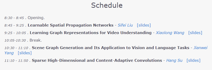 讲者:Sifei Liu, Varun Jampani, Xiaolong Wang , Dhruv Batra, Abhinav Gupta, Jan Kautz, Ming-Hsuan Yang