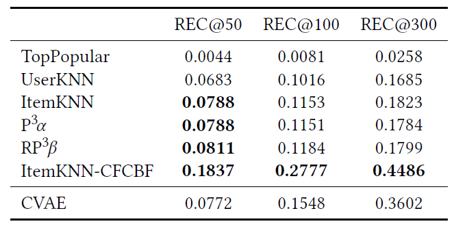 一般来说,在列表长度为50时,ItemKNN-CFCBF在所有测试的配置中始终优于CVAE。