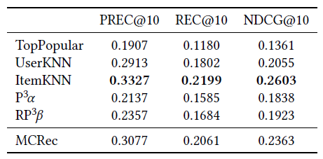 表3显示,传统的ItemKNN方法在正确调参时,在所有性能指标上都优于MCRec。