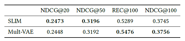 表8: Mult-VAE (Netfix data),使用原始论文中报告的指标和cutof。