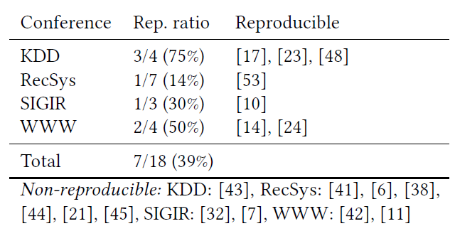 这篇论文也非常有意思,针对当前top-n推荐任务中已有前沿方法的复现性进行了一系列实验分析。考虑了过去几年在顶级研究会议上提出的18种算法(KDD、SIGIR、WWW和RecSys)。但只有7中算法能够合理地复现,并且其中6种方法没有最简单的启发式方法(例如,基于最近邻居或基于图的技术)好。另一方面,作者也发现,一些论文通常通过将一个复杂的神经模型与另一个神经模型进行比较来说明其方法的优越性但这是不够的,因为该神经模型不一定是最好的Baseline。作者也open了其代码,在文末我们也把这18篇论文列出来了。这篇工作揭示了当前机器学习科研学术中存在的一些潜在问题,值得各位科研工作者深思。