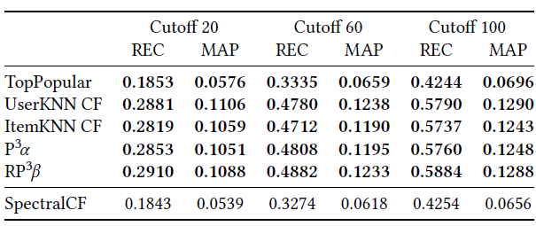 表7: SpectralCF的实验结果(MovieLens1M,使用自己的随机分割和5次重复测量)。