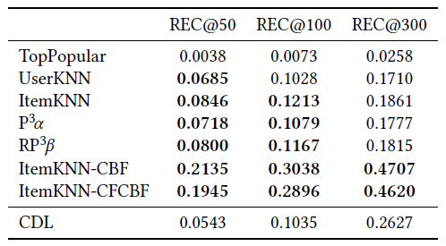所讨论的CVAE方法将KDD’15中较早且经常被引用的CDL方法[48]作为其baseline之一,并使用了相同的评估程序和CiteULike数据集。